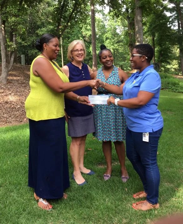 (on right) UPS Administrative Assistant Samantha Williams delivered the $15,000 donation from the UPS Foundation, (from left) Friends of Hairston Park leader, Gwendolyn Stegall gratefully received the check with GHHCDC board members Jan Costello and Nadine Rivers-Johnson.