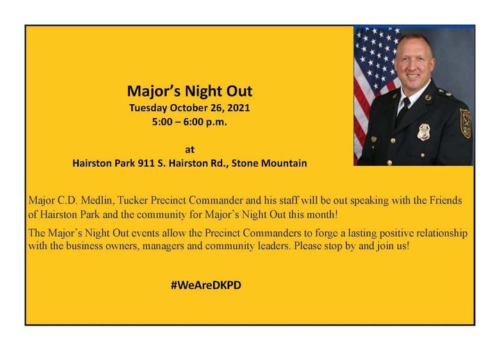 Major C.D. Medlin, Tucker Precinct Commander and his staff will be out speaking with the Friends of Hairston Park and the community for Major’s Night Out this month!